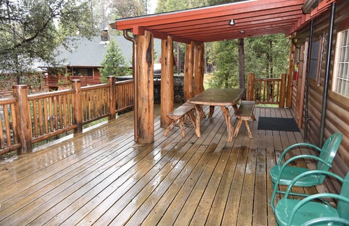 Tuolumne Meadow is a gorgeous, 2 bedroom, 1 bathroom (with a jetted tub) home that sleeps up to 6 guests. The fully equipped kitchen has granite countertops, and a gourmet Wolf range, and includes a dishwasher. The private deck has a very large, picnic table and a built-in gas grill. Attention to detail describes the features of this home with ceiling fans, forced air heat, a beautiful rock fireplace (wood provided in season), a vanity sink in the master bedroom, flat-screen satellite TVs in the living room and in both bedrooms as well as WiFi. There are plenty of movies, books, and board games. Can be rented as a one-bedroom (Call for details). No Pets Allowed. Does not have air conditioning. "EV Charging Station available within five miles of the cabin"