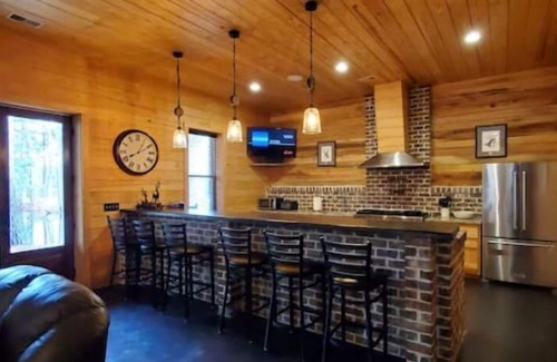 Two bedrooms have queen size beds and the other four bedrooms have a total of 8 twin beds so the house can sleep up to 12 guests. The outside of the home is all brick and the inside is all pine creating that warm cabin feel. The bedrooms are located down two hallways. Two bedrooms are located down the left hallway with a shared bathroom and one of those rooms has a queen bed and the other has two twin beds. The other four bedrooms and 3 bathrooms are located down the right hallway. Two of those bedrooms share a bathroom and one bedroom has a bathroom with shared access to the living area. The 6th bedroom has a queen bed and its own bathroom which can only be accessed from inside the room.