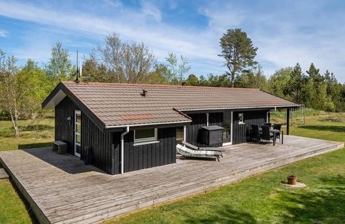 Layout: Kitchen(cooker(electric), coffee machine, microwave, dishwasher, freezer(1-59L), fridge-freezer, washing machine), Living/bed room(TV(german television channels, danish TV channels (DR1 and TV2), norvegian TV channels , swedish TV channels), CD player, chromecast), bedroom(double bed), bedroom(double bed), bedroom(2x bunk bed), bathroom(washbasin, shower, toilet), heating(electric), terrace, garden furniture, sun loungers, play equipment, air to air heatpump