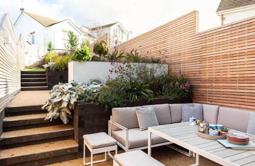 A stunning three tiered garden with pretty flowers, large corner sofa, bench, stool and table for alfresco dining, corner bench and bean bags perfect for sitting with a good book and two sun loungers. Parking for two vehicles (Please check the Need to know). Balcony accessible from the living room with sea views in the distance, two chairs and small coffee table. Balcony accessible from master bedroom with sea views, two chairs and small coffee table. Ground floor private patio access via the bedroom with a small bistro table and two chairs. Electric vehicle charging available at this property at £50 per car for stays up to seven nights. Outside surf shower. Secured gated development.