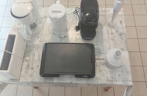 - cuisine ouverte tout équipée (2 cafetières - 1 à dosette et 1 à filtre, 1 plancha électrique petite d'intérieur, mixeur, grille-pain, bouilloire, four, micro-ondes, évier 2 bacs, plaques électriques 4 feux, 1 grand frigo avec bac congélation)