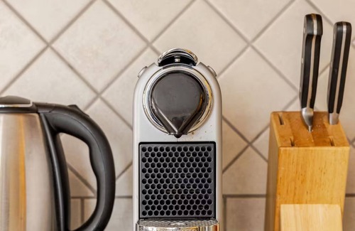 ◉ Coffee machine with capsules, toaster, and kettle for tea
