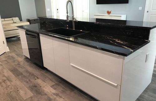 • Modern open kitchen equipped with brand-new appliances.