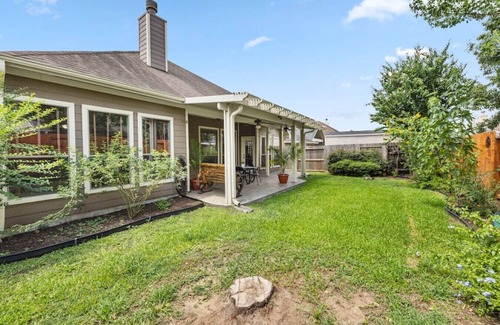 Spacious and family-friendly, this peaceful Houston retreat features 4 bedrooms, 2.5 bathrooms, Smart TV in the primary suite, foosball table, fenced yard, and covered patio. Located just minutes from Bear Creek Park, Sam Houston Race Park, dining, and shopping — with easy access to Downtown.