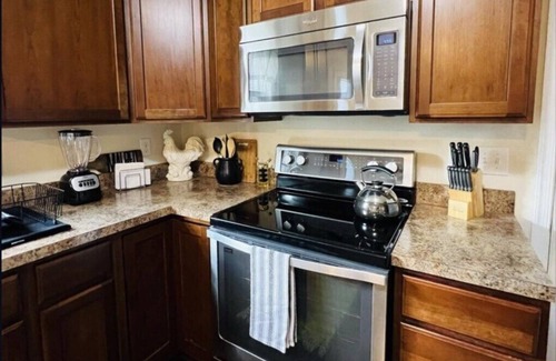 Kitchen & Dining: The fully equipped kitchen boasts modern appliances and ample counter space, making meal preparation a breeze. Enjoy your culinary creations in the eat-in kitchen, or on the back deck, with seating for 4-6 people. The kitchen is fully stocked with utensils, plates, bowls, pots, pans, baking sheets and more!