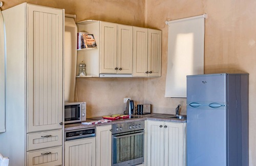 Inside, the villa boasts a fully air-conditioned environment, ensuring a comfortable stay no matter the season. The villa accommodates up to 4 guests, with two beautifully appointed bedrooms – one on the ground floor and another in the basement with twin beds for flexible sleeping arrangements. The spacious living area features cozy sofas, a TV, and high-speed Wi-Fi for entertainment and relaxation. The fully equipped kitchen and dining space are perfect for preparing meals at home, complete with a coffee machine, microwave, and all the essentials for a memorable self-catering holiday.