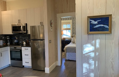 A one-bedroom carriage house apartment in a newly constructed (2018) lowcountry cottage located in the beautiful Stock Farm neighborhood of Historic Old Town Bluffton within walking distance of the many restaurants, galleries, shops and historic buildings this charming town has to offer. Comfortable, cozy and tastefully decorated, "The Bluffton Bird House" features new kitchen appliances, a full-size stacked LG washer and dryer and all the amenities necessary to guarantee a comfortable, enjoyable stay. The main room includes a sleep sofa and armchair, a breakfast counter with two counter stools which can be used as a work desk, a wall-mounted TV, full kitchen and laundry closet. The bedroom has a queen size bed with new Tuft & Needle mattress and box spring, a chest/side table, a chair and closet. The full bath has a single vanity, toilet, tiled shower and tiled floor.