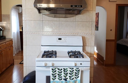This 2,000 sq. ft. apartment spans the 2nd and 3rd floors of a two-family house. It features 2 bedrooms on the 3rd floor and 3 bedrooms on the 2nd floor, totaling 3 queen-size beds and 2 full-size beds. The apartment boasts a living and dining area with hardwood floors throughout. Two private parking spaces are reserved for your convenience.