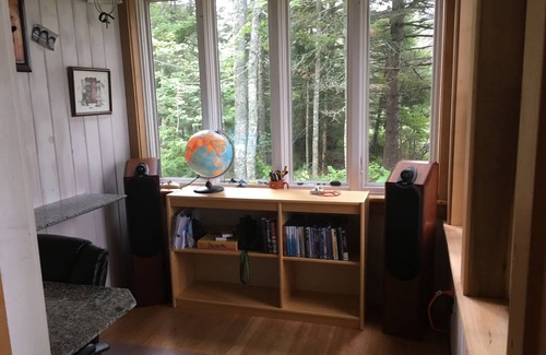 One bedroom with queen size bed. There is also a newly built bunkhouse that sleeps 2 in a very comfortable pull out couch. Small music room with wonderful piano and upright bass. Two paddleboards and a canoe on sight to explore the cove and greater pond. Spectacular sunsets from the couch. Abundant wildlife: deer, turkeys, ducks, eagles, osprey, songbirds, and fox. No television to interrupt the atmosphere. There is reasonably fast wifi.