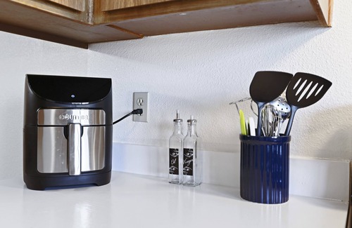 Condo is quiet and peaceful, it is geared towards travel professionals and families who have been displaced by tragedies. What is included: Two assigned parking (one carport directly behind patio C57 and a space directly in front Space 24); kitchen stocked with utensils. Air fryer, microwave, kuerig, toaster, coffee bar, stove (Black 5 burner), refrigerator, dishwasher. 2 bed rooms include a queen size bed, work space, TV, walk in closet, privacy film, black out curtains, lamps with USB hook up, ironing board, hair dryer, full length mirrors. 2 full bath rooms. Patio area has patio seats, bistro table/ chairs, washer dryer area, doggy poop area. Utilities: A/C , Xfinity internet 800 mbps, PG&E, Gas, water, garbage. Living room sofa, accent chair, egg chair and art, community swimming pool. High ceiling beams. No smoking inside but smoking area allowed outside in patio area. 24/7 security through CSI security