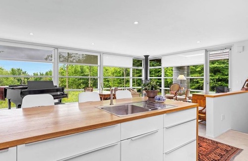 We designed and built GlasHaus as a place to escape to from the bustle of our careers, though it has since become our permanent winter home. The space can comfortably accomodate two couples or a small family. It includes a modern kitchen with induction cooktop and convection range, an incredible living space that places you in the midst of the outdoors, and a cozy master suite - with a Queen size bed that shares the gorgeous view of grass and forest. Walk down the floating staircase to the lower level and you'll find a comfortable recreation room, second bedroom and bath, along with a convenient home office space complete with desk and ethernet connection for remote work or just surfing the web. Plus, there are full laundry facilities. Note that 2025 is the first year we are renting GlasHaus.