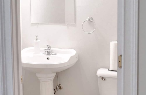 Our spacious master bedroom has a king-sized bed, a 43" smart TV, a walk-in closet, and an en suite bathroom with a shower and a jetted tub. Two additional bedrooms have full-sized beds with bedside tables, lamps, chest of drawers, and ample closet space. Each bedroom is supplied with a steam iron and an iron board. For safety, please use iron boards when ironing. Additionally, a few lamps are equipped with USB ports. Please check for ports on the rear of lamps.
