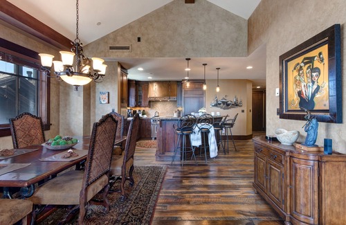 Guests will delight in the many upgraded features and lux amenities of this Deer Valley home. The gourmet eat-in kitchen is fully equipped with everything you need to make, serve & enjoy home-cooked or private chef-prepared meals the entire time you're in residence, opening to a large dining room that comfortably seats 6-8 people, and also opens to a private balcony, with an in-line grill and views of the Lady Morgan ski runs and beyond.