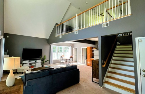 The property sits on 6 acres of private land, adjacent to nearly 800 acres of wooded conservation land. Enjoy the views of local wildlife from the picture windows in the loft or the dining area. The apartment has a private walk-up entrance and includes a bedroom, bathroom with a large shower, living area, kitchenette with dining area, and a loft. The loft includes a queen size bed. The living area also has a pull out sofa for guests as well. The kitchenette includes a full size refrigerator, full size sink, coffee bar, air fryer, toaster oven, electric skillet, and microwave oven. There is a 75" tv and video game consoles to enjoy. High speed internet for anyone who needs to work. Central Heat/Air Conditioning are also in the apartment.