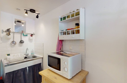 The kitchen is equipped with an oven, a stovetop, and a refrigerator, as well as a coffee maker, an electric kettle, and a microwave. And there is a laundromat nearby so you can pack a bit lighter. Other amenities include bed sheets, heating, limited housekeeping, and a dining table.