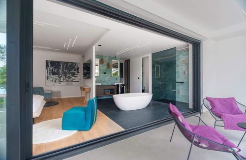 Villa 3M Rovinj has four bedrooms with private bathrooms, three of which are located on the first floor and one on the second floor, while in the basement there is an additional separate bathroom. If you think it's difficult to move around this spacious villa, don't worry, there is also a lift in the villa. All bedrooms are equipped with ventilation and underfloor heating, and one of the first-floor bedrooms stands out because not only does it have a bathtub in the room, but it also has access to a balcony with comfortable chairs and sun loungers to enjoy the view.