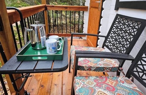 Deck has two chairs and drop down table. Two Adirondack chairs and solo stove for outside fires. Picnic table for outside dining.
