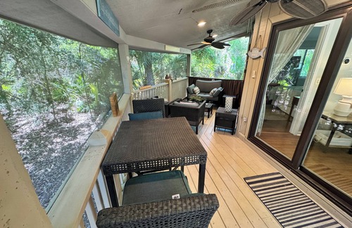 Tucked away in the heart of Sea Pines in Night Heron, this charming 1-bedroom, 1-bath getaway offers a peaceful escape just a short stroll from the beach. Surrounded by lush woodlands and coastal serenity, this cozy villa is perfect for couples or solo travelers looking to unwind and recharge. This home features a spacious screened porch with lots of room for lounging while soaking in the lush surroundings, listening to birds, dining, playing games, or enjoying a good book.