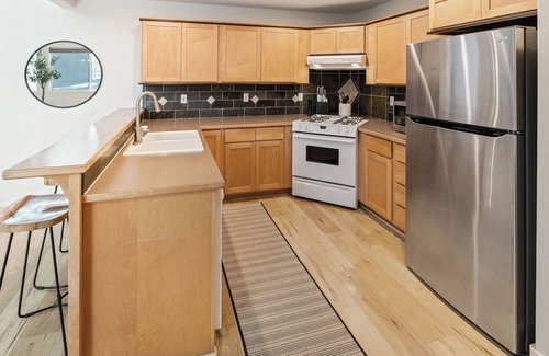 The property features two inviting queen beds and a cozy twin bed tucked away in a charming hideaway nook off the living area, perfect for families, small groups, or couples. The loft with one Queen bed provides some limited privacy and flexibility for additional sleeping, but be advised that it is accessible by a ladder. The bedroom has a Queen bed and small private balcony, perfect for some fresh morning air with a nice cup of coffee or tea. Two full bathrooms ensure convenience for all guests. The open-concept living area is filled with natural light and offers sweeping city views, making it the perfect spot to sip your morning coffee or unwind after a day of exploring. Foodies and home chefs will love the fully-stocked kitchen, complete with a coffee maker, full-size fridge, stove, microwave, and all the essentials needed to prepare anything from a quick breakfast to a gourmet dinner.