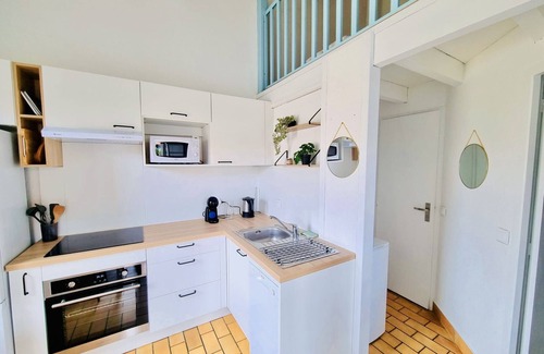 On the ground floor: a living room with an open equipped kitchenette: ceramic hob, microwave, oven, dishwasher, washing machine, fridge/freezer, storage, Dolce Gusto coffee maker, ... A shower room with shower and washbasin, a separate toilet, a bedroom with a 140 cm bed overlooking the private courtyard. Upstairs, an open mezzanine with 4 80 cm beds. A 22m² private terrace with garden furniture and a plancha. Private parking. Accommodation for 4/6 people. Ideal for a family with children. High chair + travel cot available in the accommodation. Pets not allowed.