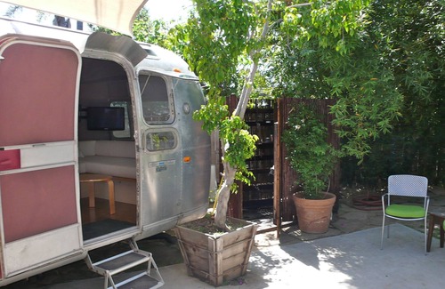 Why stay in a hotel or motel when you can have your own Airstream adventure for less? Parked in the backyard of a private home, this private 27 foot Airstream comes with everything you need for an enjoyable stay. The Airstream is located on our pie shaped lot toward the back - our lot goes street to street - the Airstream guests use the back gate to enter. The 1974 Airstream has been completely re designed in an eco chic style with cork flooring, wrap around lounge, small kitchenette, organic queen mattress, private W/C and outdoor hot shower. There is a flat screen TV with roku, high speed wi-fi, a work space, small refrigerator, kettle, coffee press and sink.