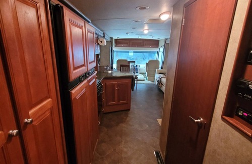 The fully equipped kitchen, with a refrigerator, stove, oven, microwave, and Keurig coffee maker, is perfect for preparing meals, whether it’s breakfast or dinner. The cabinets and pantry are stocked with dishes, silverware, cookware, pots, pans, and glasses. The living/dining area features a four-seat dining table, a cozy couch with a matching recliner, and two captains chairs that rotate for extra seating. Overhead cabinets contain DVDs, games, and books for your enjoyment.