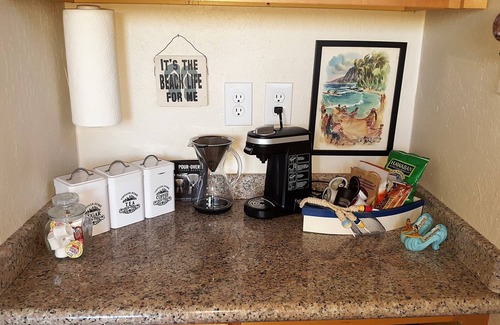 • Kitchen includes mini fridge, K-pod coffee brewer, pour over carafe, large toaster oven, small, microwave, electric griddle, electric kettle, blender, small crock pot, and dishes and utensils and other essentials like coffee, tea, sugar, paper towels etc. Pots and pans provided for the BBQ and BBQ utensils are stored with the BBQ.