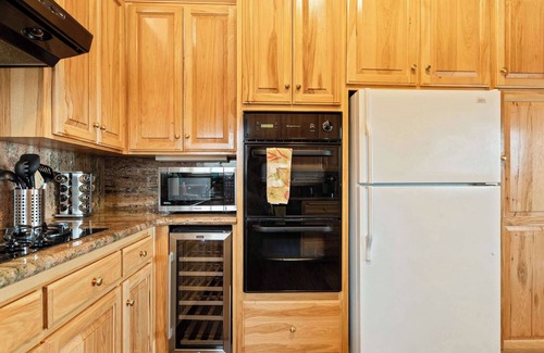 Alpen Adventures has an awesome location for exploring all the best of Lake Arrowhead, but there’s fun to be had right at home too! An enclosed trampoline offers hours of outdoor play for young travelers, while the indoor game room boasts a poker table, large sectional couch, and smart tv. Whether it’s movie night or poker night, this cozy room promises an awesome time! Back upstairs, the fully equipped kitchen has all the appliances, cookware, and space you’ll need to whip up delicious meals at home. Gather to share quality time and yummy food at the dining table set for 8.