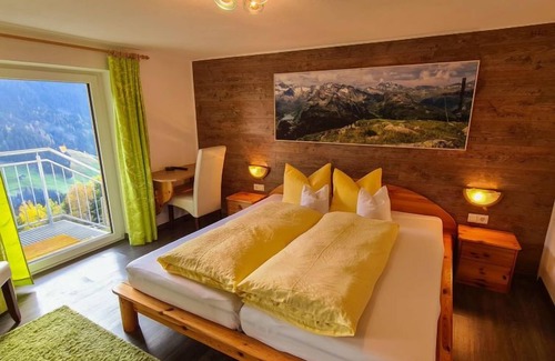"Alpenliebe", 4-room apartment 105 m2 on 2 levels. Beautiful furnishings: 2 rooms, each room with 1 bed and 1 double bed. Exit to the balcony. Kitchen-/living room (oven, dishwasher, 4 ceramic glass hob hotplates, toaster, kettle, microwave, electric coffee machine) with dining table and satellite TV. Exit to the balcony. Shower, shower/WC, sep. WC. Oil heating. On the lower ground floor: 1 room with 1 double bed, hand-basin and shower. Exit to the garden. Balcony. Balcony furniture, barbecue, sitting area. Panoramic view of the mountains and the valley. Facilities: children's high chair, baby cot. Internet (WiFi, free). Please note: one double bedroom is outside the apartment. Non-smokers only. 1 pet/ dog allowed. Smoke alarm, fire extinguisher. No internal connecting door between the floors.