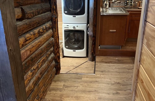 The Alyeska spruce cabin boasts the space saving features of a tiny home, which helps us accommodate a full kitchen with all the accessories, a 3/4 bath, and full laundry area while still maintaining a tiny footprint on Mother Nature.