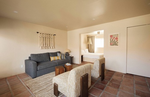 One-of-a -kind apartment offers an exceptional 1-bedroom space on the ground level. It features 1 queen bed and 1 sleeper sofa in an open studio layout, along with amenities such as a washer/dryer, kitchenette, shower, AC/heat, smart TV, fridge, microwave, and coffee maker. Enjoy the view of the courtyard garden from this uniquely styled ground-floor apartment.