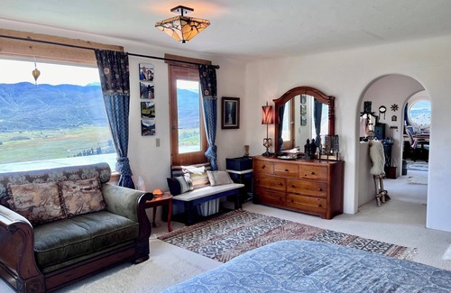 Amazing adobe home, two bedrooms, including large suite (1,200 sf) on top floor, with private bath and sitting room / sanctuary / office. Main floor (2,000 sf) has one additional bedroom, large open living area, kitchen, dining, greenhouse, and separate office -- and a large deck overlooking the valley.
