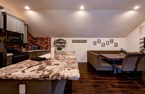 Home has two separate cooking areas and living spaces, perfect for separating groups if needed. Private hot tub for guests only! Everything is new and feels like you're at a resort.