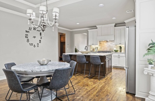 Sharpen cooking skills in a fully equipped kitchen, with premium cookware and appliances. 65 in Smart TVs, leather sofas and modern vibes. This is an Ideal place for anyone looking to enjoy privacy, comfort while working in Tulsa or visiting with family and friends. Fully fenced backyard. Three car garage!