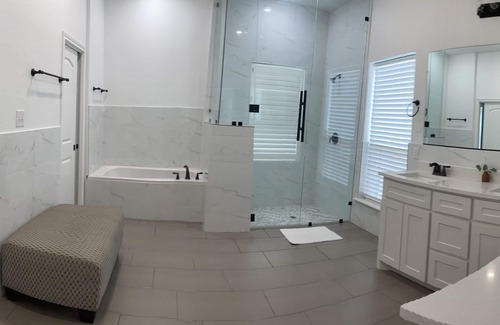 The upstairs features a second large master suite with a queen size bed, a smart TV, two large vanity areas, a shower and bathtub,