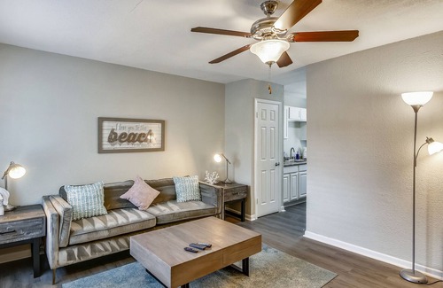 Upon entering this charming Galveston Vacation Condo, guests will appreciate the modern decor, laminate flooring throughout and are able to enjoy the spacious living area, flat-screen TV, Wi-Fi, central heat and AC, ceiling fans in the living area and bedrooms.