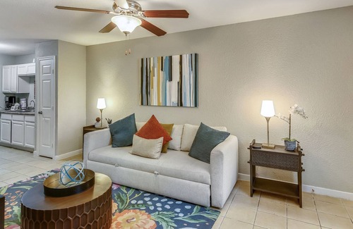 Upon entering this charming Galveston Vacation Condo, guests will appreciate the modern decor, ceramic tile throughout and are able to enjoy the spacious living area, flat-screen TV, Wi-Fi, central heat and AC, ceiling fans in the living area and bedrooms.