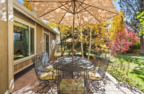 The fully equipped kitchen is designed for ease and connection, with a breakfast bar, extendable dining table, and sliding glass doors that lead out to your private deck. There, an outdoor dining set offers the perfect perch for alfresco meals as the sun sinks behind the mountains. Inside, a smart TV, relaxed furniture, and soft lighting make it easy to settle in and linger. For the little travelers, enjoy a high chair and toys.