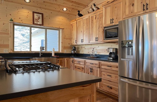 When you enter the home, you are greeted with an open floor plan. There is a dining area with plenty of space for six individuals. Just across the way in the spacious kitchen you can enjoy three seats at the island, and stainless-steel appliances. Out the kitchen window one has a gorgeous view of Sheep Mountain. The living area is situated so the family can not only enjoy the spectacular views but can cozy up next to the fireplace in the evening. The house is also adorned with many different animal mounts that are great conversation pieces and also add to the nature feel of the home. Down the hall you will find the master bedroom featuring a king bed, and a large, attached master bath. The master bath has a double vanity for plenty of space, a soaking tub with magnificent views, and a beautiful tile walk-in shower. The other two bedrooms in the home both have queen beds and share a Jack and Jill bathroom. This shared bathroom has a large vanity area, and a tub/shower combo. There is also a half bath in the hallway. Need to do some laundry while on vacation? Take full advantage of the roomy laundry room with washer/dryer, ironing board and folding area. There are 5 televisions in the property: living room, bedrooms, and an outdoor patio television. The two-car garage is accessible for guest use. The AO Ranch is the perfect home away from home while visiting the Cody/Yellowstone area and looking for the rustic yet modern cabin experience.
