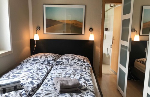 The 40 sqm apartment is located in. 1 Upstairs in a quiet courtyard area. The bedroom has a queen bed (1,40x2,00 m). An additional sleeping space provides the comfortable sofa bed in the living room (1,40x2,00 m) The bathroom has a bath with shower screen and a hair dryer is available. The kitchen is equipped with electric cooker / oven, ceramic hob, fridge freezer, microwave, coffee maker, kettle and further extensive kitchen interior. There is a dining area for 2 people with wall table and highchairs. It is possible to provide a washing machine on request in the apartment. The living room has a flat screen TV, DVD player, radio / CD.