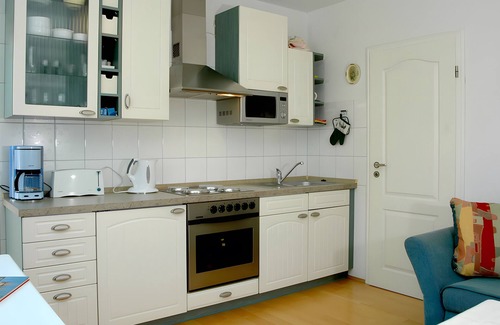 FEWO. Lawn for both apartments with garden furniture. The apartments can be connected by an internal corridor. The house is situated on a slope, a staircase leads to the 2-room apartment on the first floor and to the beautiful adjoining terrace.