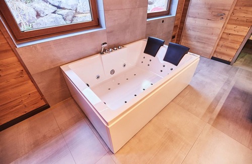 - 1 bedroom with box spring bed, whirlpool, shower, sauna, sink, toilet and underfloor heating