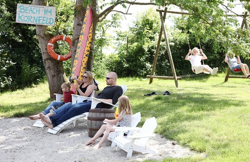 The apartment "Utspann" on our farm invites, as their Low German name reveals, to relax. It is at ground level, 72sqm in size and thus offers plenty of space for up to 5 people. From the hall you look through the porthole door into the living and dining room. Here you can make yourself comfortable on the big sofa or in the armchairs. Your two bedrooms are equipped with a large box spring bed for two and a double bed. A modern kitchen and a chic bathroom are of course also included, plus you have a large south-facing terrace. Also on the entire court yard you will find enough favorite places for young and old. Especially in the colder months, it can be well in the well-being sauna in the barn or in the log cabin with fireplace. For the little ones are waiting our farm animals, dinocars and other vehicles, a playground and trampoline, an arcade, table football, table tennis, a games room and a huge garden to let off steam. So, let's go, just go for a swim!