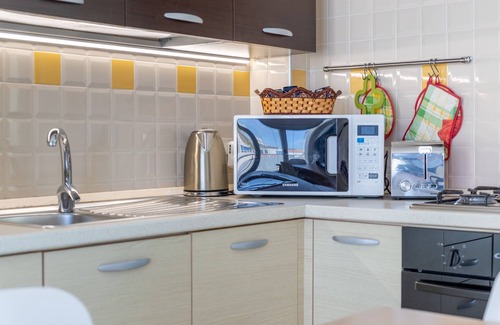 Suitable for families, the kitchen is equipped with microwave oven, kettle, espresso machine with pods, toaster, refrigerator and kitchen accessories.