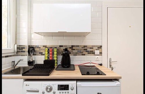 - Equipped kitchenette: vitroceramic hob, fridge, microwave-grill, capsule coffee machine, toaster, washing machine dryer combined.