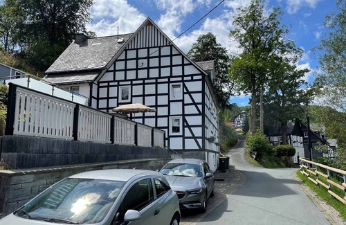 Located in Schmallenberg, this non-smoking 80 sqm apartment on the 1st floor accommodates up to 4 guests in 2 bedrooms, each equipped with a double bed. You will find a private fully-equipped kitchen with an open living area featuring a dining space for 4 people. Amenities include Wi-Fi, smart TV with internet radio, individual TVs in each bedroom, private sauna for up to 2 people, baby bed, and highchair. The kitchen comes with a hair dryer, iron, ironing board, coffee machine, kettle, Senseo machine, electric milk frother, toaster, microwave, and raclette grill. A bathroom with shower and toilet plus a guest toilet complete the accommodation.