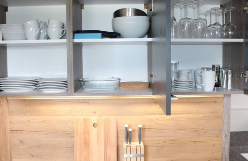Bathroom with toilet, shower, large mirror cabinet and vanity. Hairdryer available. Again, ceiling heating and integrated ventilation system are available. Please remember: also towels and tea towels must be brought.