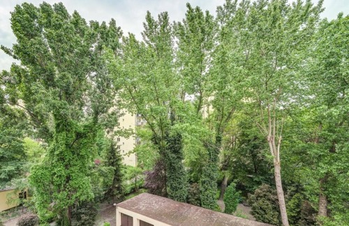 After a day of exploring, relax on the comfortable sofa and watch your favorite shows on the large TV 📺. The window offers a pleasant, green view 🌳, providing a peaceful retreat in the very center of the city.