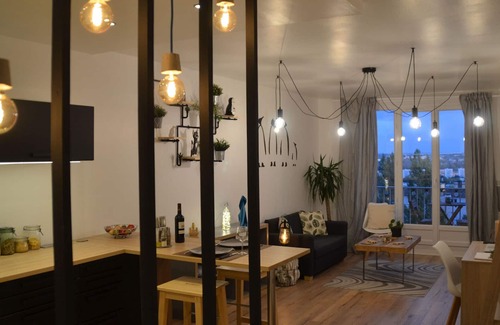 Set down your suitcases in this newly renovated 50m2 apartment which offers a breathtaking view of Le Mans. Do you want to discover Le Mans? Equipped with a parking space, you will enjoy the city center 5 minutes away or you will easily escape to discover the surroundings. Are you on a business trip? The calm of the residence will allow you to rest between two days. The accommodation is located on the 7th floor with elevator, accessible without stairs between the car park and the elevator. The 10m2 room is equipped with a bed for 2 people, the bedding is less than a year old. Electrical outlets on each side of the bed allow you to charge your phone or computer if necessary. It is exposed to the north which allows to have fresh air in the evening during the summer days. The bathroom is spacious. It has a shower, sink, washing machine, ironing board and iron. The main room consists of an equipped kitchen open to the living room/living room. You will find all the equipment there to heat up a quick dish, or also to cook: Dishwasher, induction hob, oven, refrigerator, dishes…. A high table for 2 people allows meals to be served. The dining area can be equipped with a table for 4 people (Console on the wall in the photos that can be unfolded) The lounge area is located facing the breathtaking view of Le Mans. Facing south, you will admire the sky. The living room is equipped with a television, Bluetooth stereo, board games... The balcony will allow you to enjoy the outside air. It overlooks the park of the residence. Forget passing cars, listen instead to the cries of birds in the hanging chair! In winter, the apartment has underfloor heating. It also has auxiliary heaters if needed. Entry into the accommodation is done independently, from 3 [hidden] on the day of your arrival. You have no time constraints for your arrival, I nevertheless remain available by phone and ready to move if necessary! Unless stated, services such as cleaning, bed linen, towels etc. are not included in the price of this rental. If pets are allowed (information in the advertisement), charges may be applicable. Only equipment mentioned in this advertisement are present. Equipment not mentioned are not considered to be present.