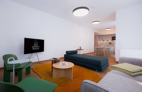 Here you can expect large window fronts, state-of-the-art ventilation system, W-LAN, , elevator, high-quality designer furniture, a bedroom with box spring bed, Smart TV in the living room, modern fully equipped kitchen with dishwasher, a large bathroom with bathtub, washbasin with mirror and toilet. The apartment also has a comfortable sofa and an open dining area with seating for 4 people.